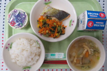 ごはん、牛乳、いわしのしょうが煮、かぶのゆず和え、じゃがいもと卵の味噌汁、ぶどうゼリー