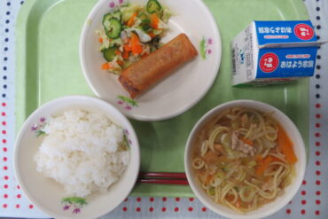 ごはん(減量)、牛乳、春巻き、即席漬け、五目ラーメン