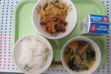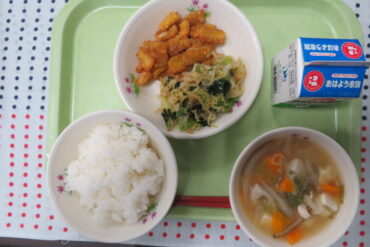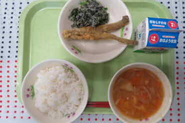 ごはん、牛乳、げんげのから揚げ、ほうれん草とえのきのごまみそ、里芋のそぼろ煮