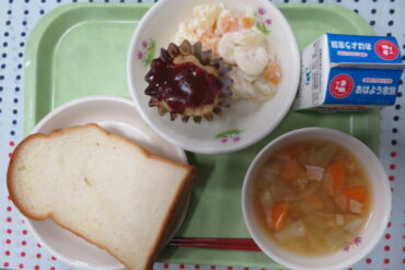 食パン、牛乳、変わりミートローフ、フルーツヨーグルトあえ、キャベツのもちもちスープ