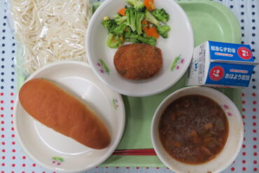 1/2コッペパン、牛乳、菜っ葉コロッケ、ブロッコリーのサラダ、ソフト麵の肉みそかけ