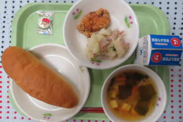 コッペパン、牛乳、鶏肉のから揚げ、ジャーマンポテト、わかめのスープ、チーズ