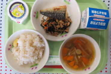 栗ごはん、牛乳、鯖の塩焼き、ひじきの炒め煮、団子汁、お月見ゼリー