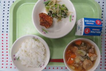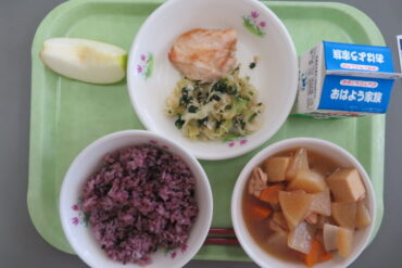 赤米ごはん、牛乳、鶏肉の香り焼き、ほうれん草のごまひたし、かたかご煮、りんご