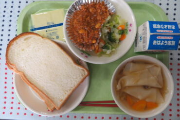 食パン、牛乳、セルフサンド、野菜サラダ、スライスチーズ、ワンタンスープ