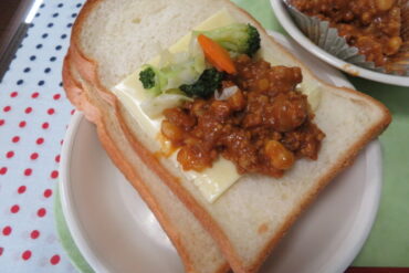 *スライスチーズと野菜とキーマをたっぷりと食パンにはさんで食べると、いろいろな味のハーモニーが楽しめました。ワンタンがつるんとしてとってもおいしかったです。ごちそうさまでした。