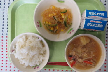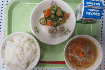 ごはん、牛乳、肉シューマイ、きゅうりのナムル、ビーフンスープ