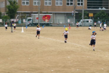 体育の学習は、持久走の単元に入りました。広いグラウンドのトラックを3周し、600メートル走ります。