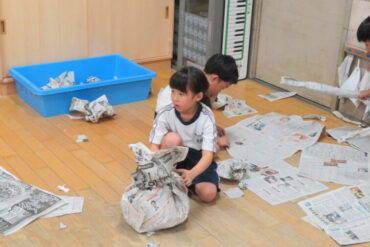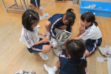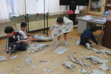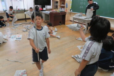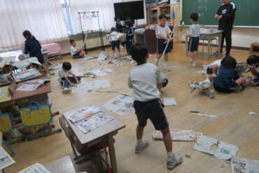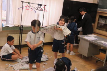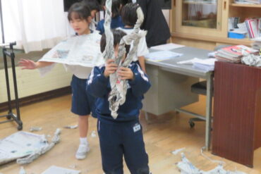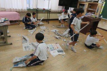 2025.10.20 NEW 2年生 2025.10.20 2年生 どんどん かわるよ 新聞紙 教室いっぱいに新聞紙を広げて楽しんでいます。 ちぎったり、丸めたり、折ったりしているうちに、どんどんアイディアが広がっていくようです。 いっぱい新聞を降らせると、嵐みたいだ~。 棒を作ったら剣みたいになったよ。 明日は校外学習!晴れるようにてるてる坊主を作ろう! 思い思いに活動して、とても楽しかったようです。 後片付けもしっかりとできました。