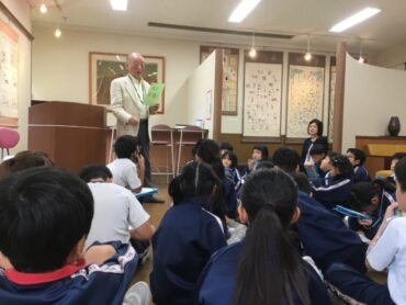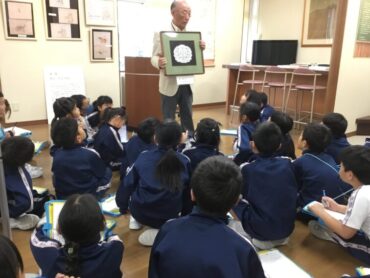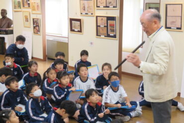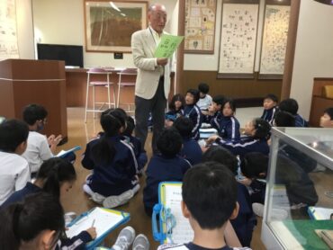 松本館長さんが小学校3年生だった頃の学校生活についてのお話や、博労小学校の卒業生が大切にしてきた「永遠の友情」「博愛」「品行方正」などの言葉について紹介してくださいました。