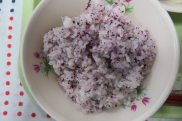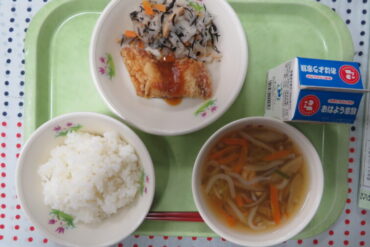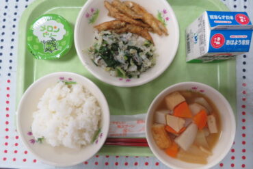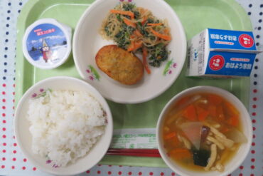 ごはん、牛乳、里芋ハンバーグ、高岡野菜のごま和え、高岡つくりもん汁、お祝いゼリー