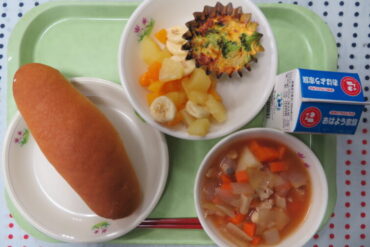 米粉入りパン、牛乳、ブロッコリーとベーコンのキッシュ、フルーツあえ、ポークビーンズ