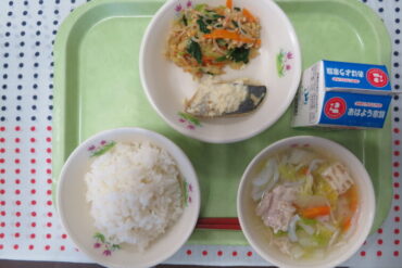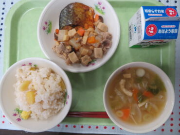 栗ごはん、牛乳、サバの香味焼き、五目豆、えのきと白菜の味噌汁