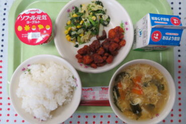 ごはん、牛乳、豚肉とレバーのケチャップがらめ、青菜のコーン和え、かきたまスープ、ヨーグルト