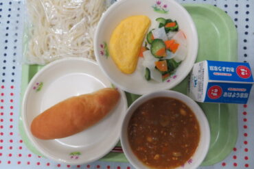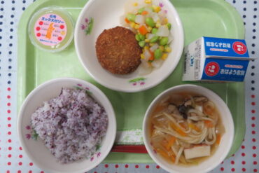 ハト麦入りしそごはん、牛乳、ゴーセイなメンチカツ、枝豆サラダ、氷見うどん汁、6市ミックスゼリー