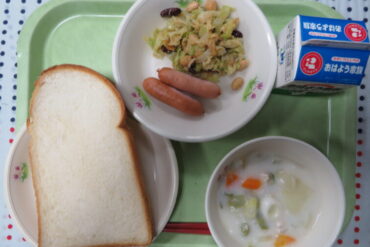 食パン、牛乳、粗びきウィンナー、豆いろいろサラダ、白ネギの米粉シチュー