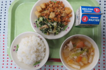 ごはん、牛乳、ミックス味噌豆、小松菜と生しいたけのひたし、キムチ汁