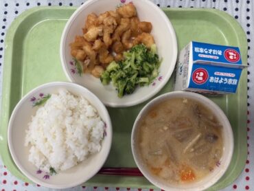ごはん、牛乳、鶏肉の米粉揚げ、野菜炒め、さつま汁、みかん