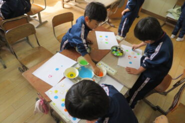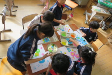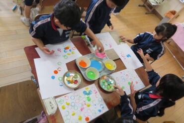今日はペットボトルのキャップを使い、スタンプをしています。裏表で異なる形を楽しんだり、色の組み合わせを工夫したりしながら楽しく活動しました。
