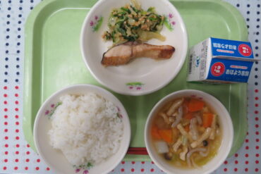 ごはん、牛乳、ふくらぎの照り焼き、ほうれん草の納豆和え、冬野菜汁