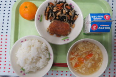 ごはん、牛乳、さばの味噌だれかけ、ひじきの炒め煮、かきたま汁、みかん