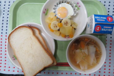 食パン、牛乳、巣ごもり卵、フルーツ和え、ワンタンスープ