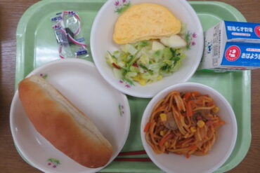2/3コッペパン、牛乳、オムレツ、白菜とりんごのサラダ、トマトスパゲッティ、干しプルーン