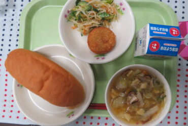 米粉入りパン、牛乳、高岡元気コロッケ、三色ナムル、肉団子ス-プ
