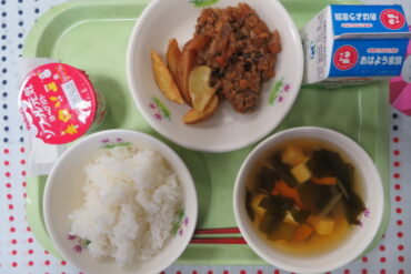 高岡野菜の肉みそ丼、牛乳、フライドポテト、ヨーグルト、わかめのすまし汁