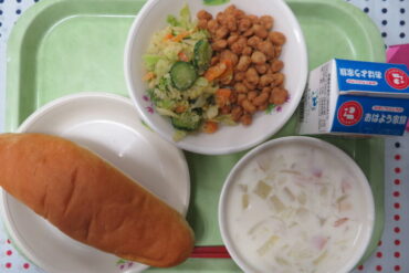 コッペパン、牛乳、きなこ豆、ドレッシングサラダ、大根ポタージュ