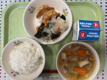 ごはん、牛乳、フライぎょうざ、大根サラダ、八宝菜