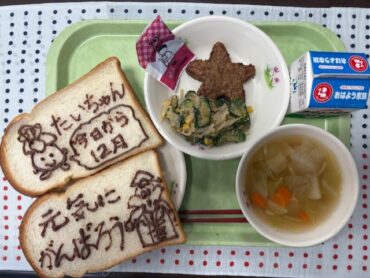 2025.12.1 NEW 今日の給食 2025.12.1 今日の給食(12月) 12月1日(月) 食パン、牛乳、星型ハンバーグ、こんにゃくサラダ、ポトフ、チョコレートクリーム *ハンバーグが星型で、食べるのがもったいないくらいでした。サラダはいつものごまサラダにこんにゃくが入っていて食感がちがってよかったです。ポトフのじゃがいもがほくほくでおいしかったです。ごちそうさまでした。 職員室