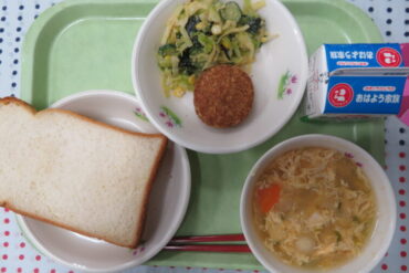 食パン、牛乳、高岡野菜のメンチカツ、海藻サラダ、かきたまスープ