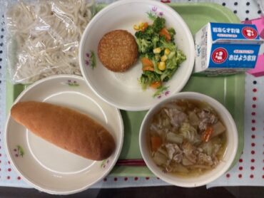 1/2コッペパン、牛乳、たかおか元気コロッケ、ブロッコリーサラダ、ソフト麵のラーメン風