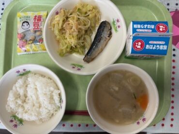 ごはん、牛乳、イワシの梅煮、キャベツともやしのあえもの、ごま団子汁、節分豆
