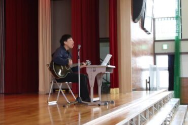 6年担任から、6年生と博労っ子へのエールとして弾き語りのプレゼントがありました。